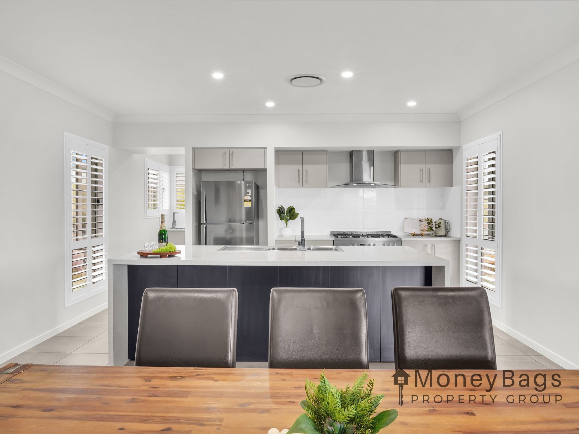 Stepping inside, you’re welcomed into the expansive open-plan living, dining and kitchen zone, where everyday living and entertaining flow seamlessly. The kitchen is the true heart of the home, complete with a fantastic butler’s pantry, stylish tiles, and quality finishes throughout. Plantation shutters add timeless sophistication, while natural light enhances the fresh, modern design.