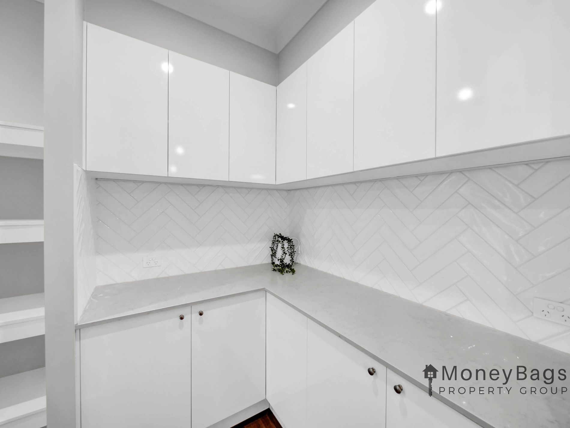 At the heart of the home lies an expansive open-plan kitchen, living, and dining area, the true social hub of the residence. Featuring stone benchtops, an oversized walk-in pantry, and seamless integration with both indoor and outdoor living areas, the kitchen delivers both function and finesse.
