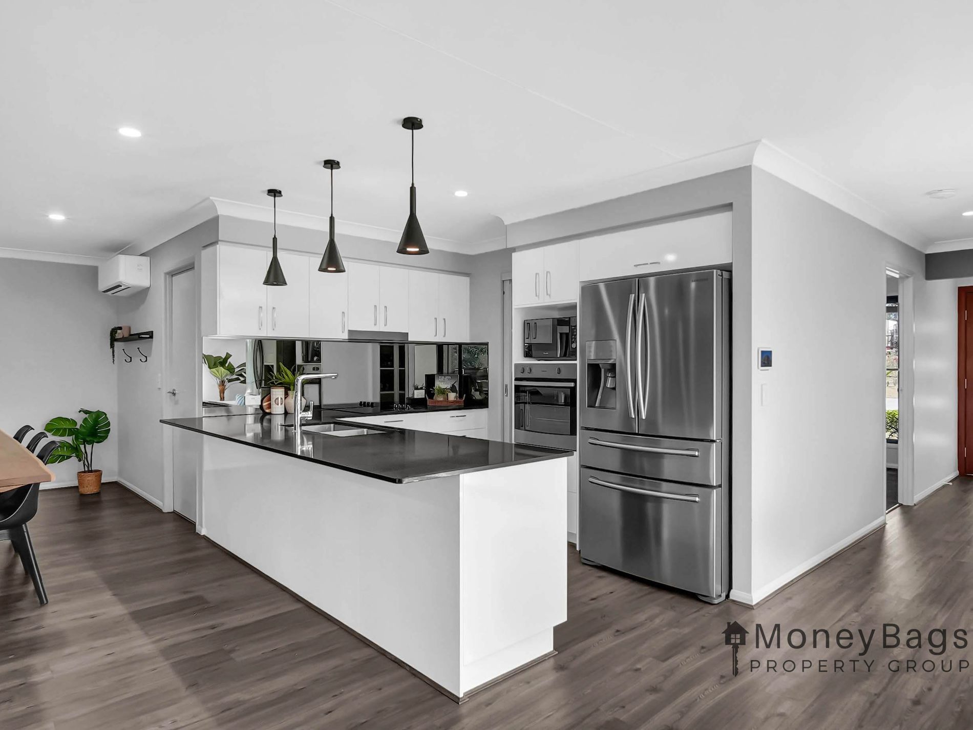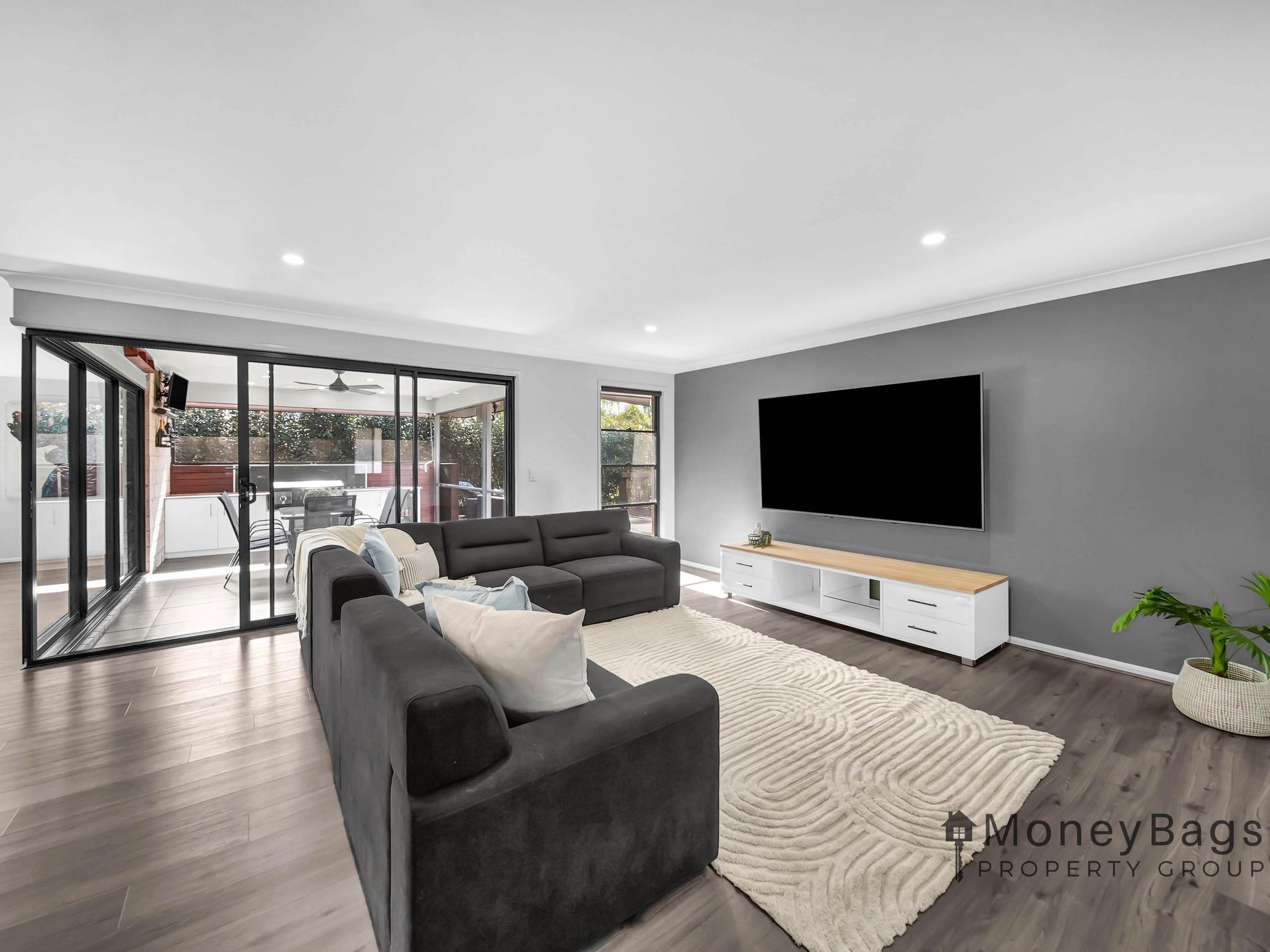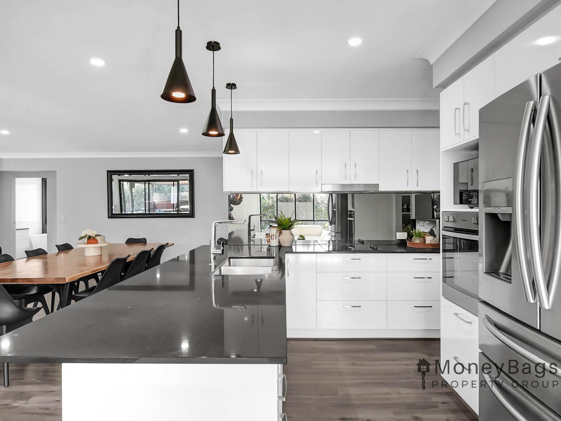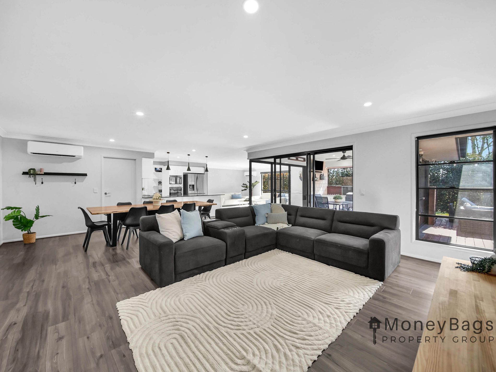 From the moment you arrive, the home’s street presence impresses. A concrete driveway leads you to the residence, while a bitumen drive continues down the side to the shed, offering easy access and practicality. Inside, you’re greeted by a modern monochrome colour scheme and a flowing floor plan designed with family living in mind.