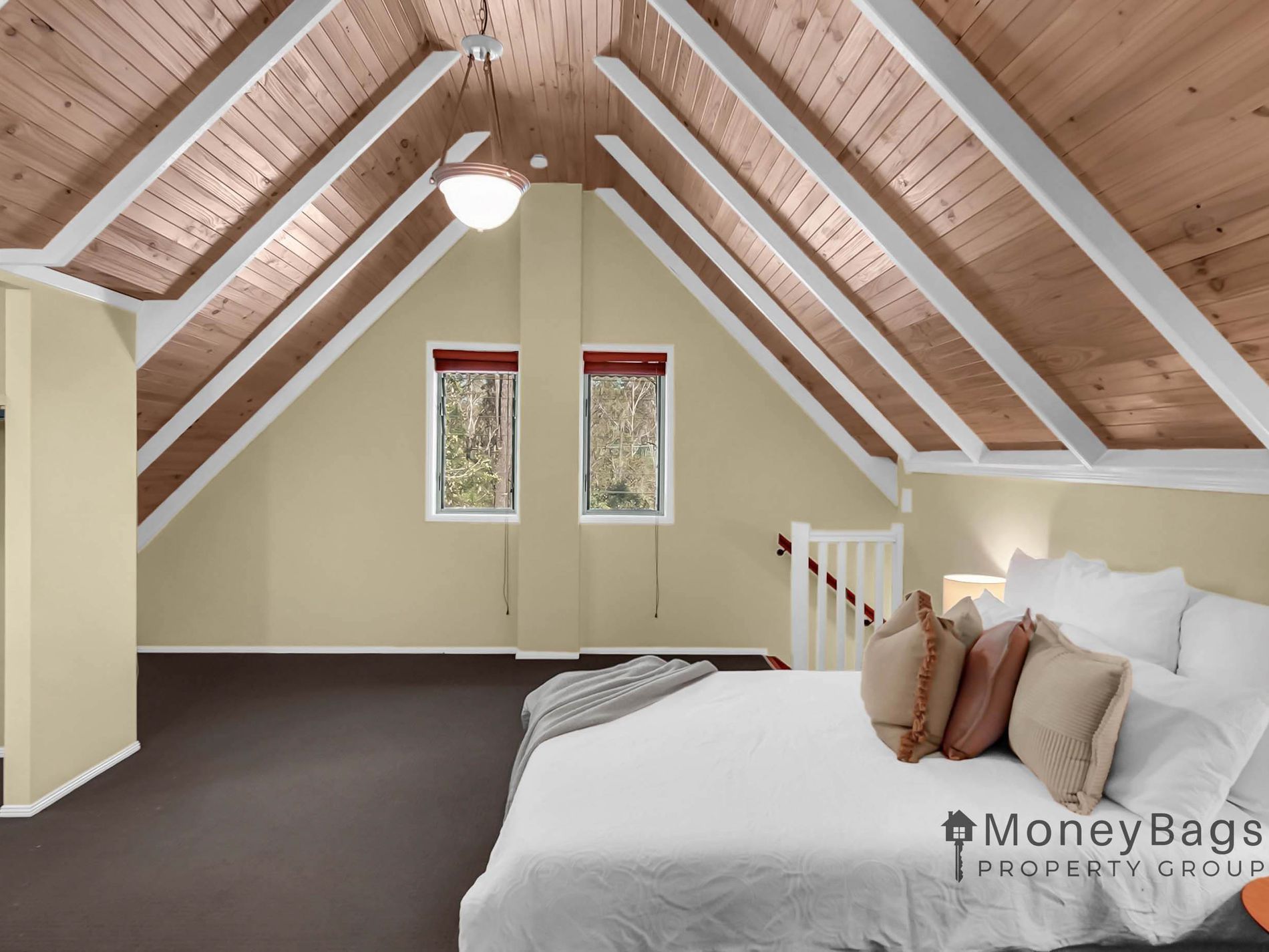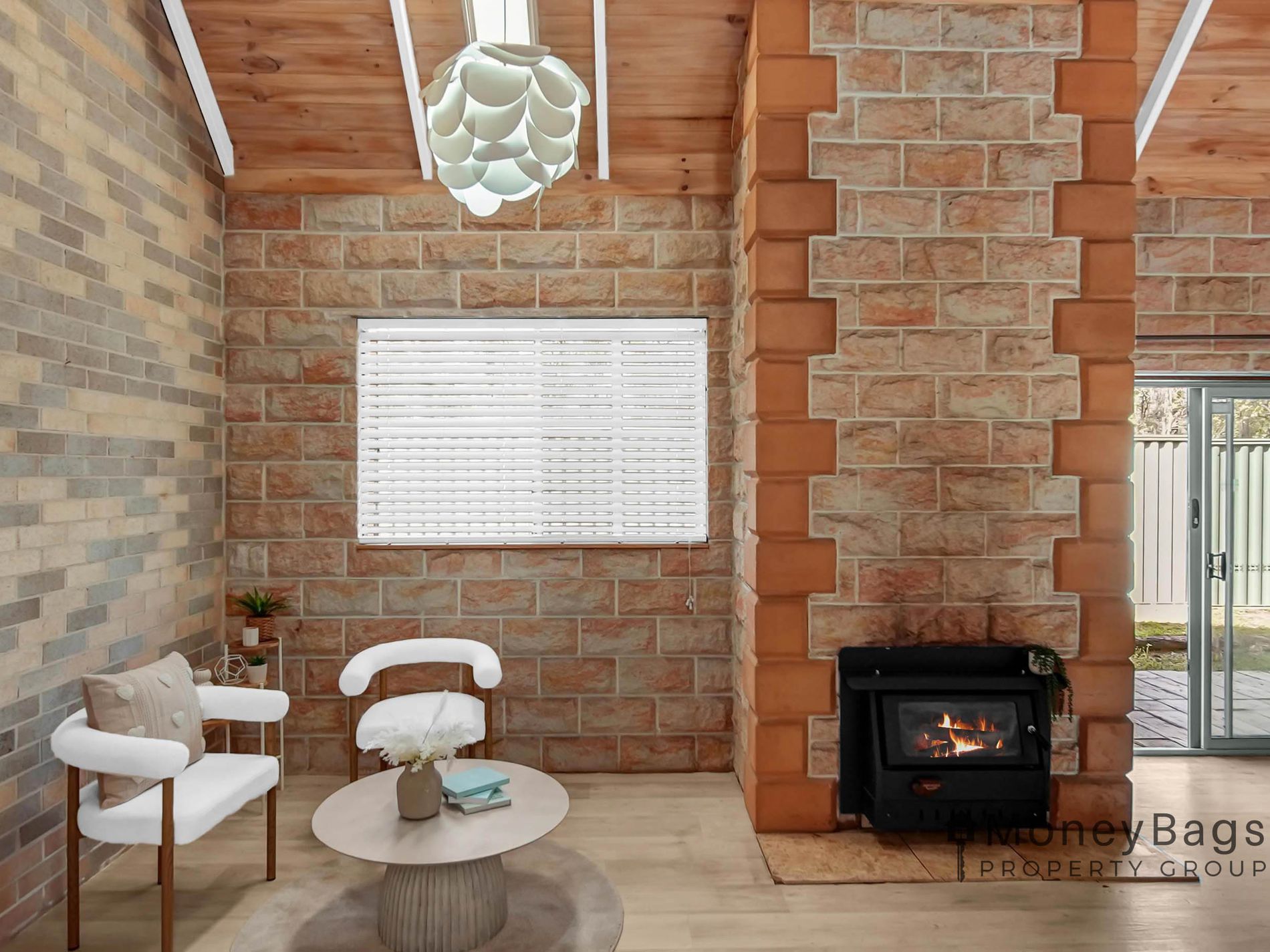 The loft-style master retreat includes a walk-through wardrobe and a beautifully renovated ensuite, while the remaining bedrooms are positioned for privacy and comfort. A fireplace warms the main living zone, adding to the home’s inviting atmosphere.