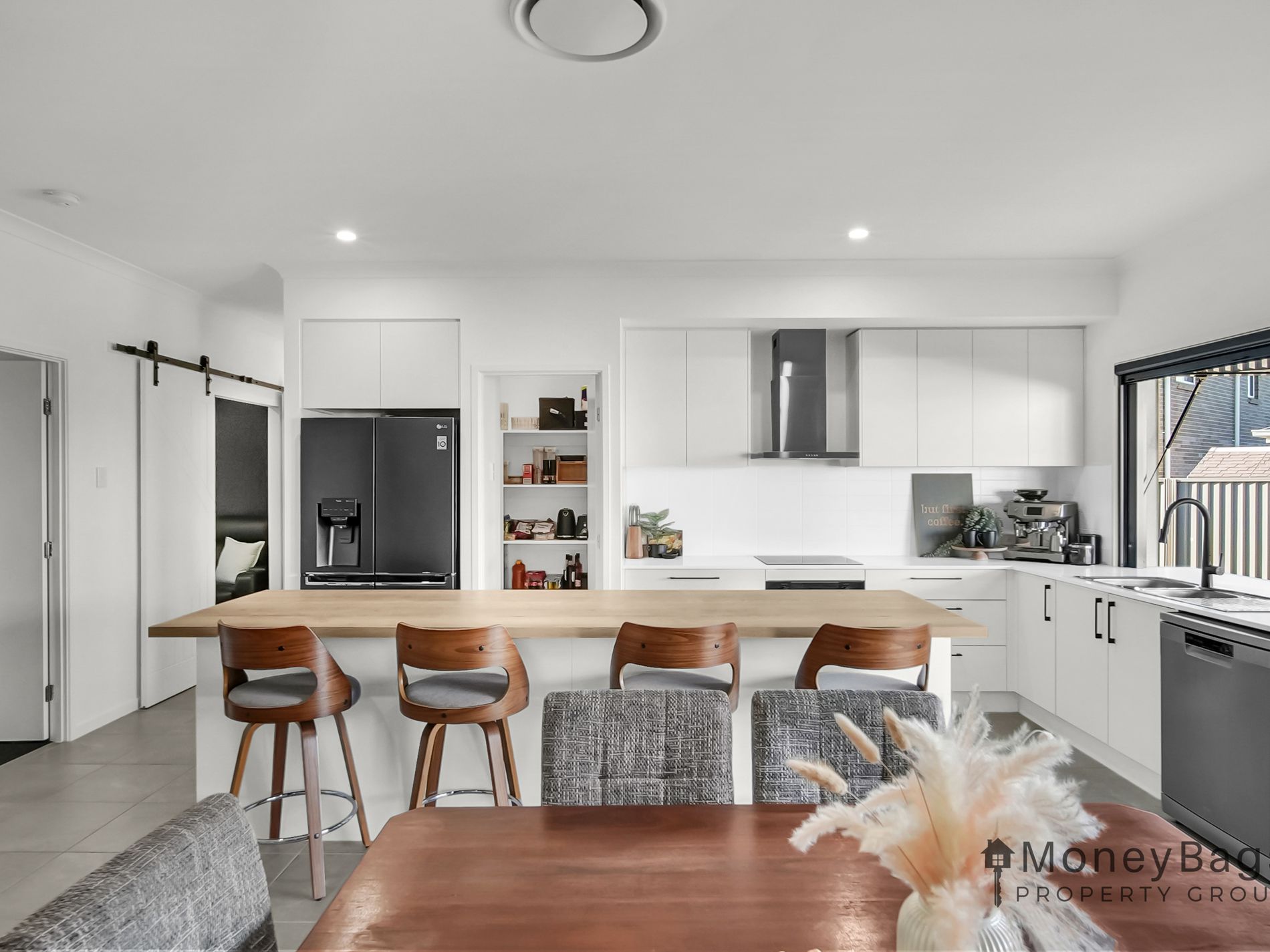 At the heart of the home is the standout kitchen – a true showpiece featuring a large walk-in pantry, stunning butcher’s block benchtop and ample storage. Overlooking the open plan living and dining area, it’s perfectly positioned for entertaining or keeping an eye on the kids while preparing meals.